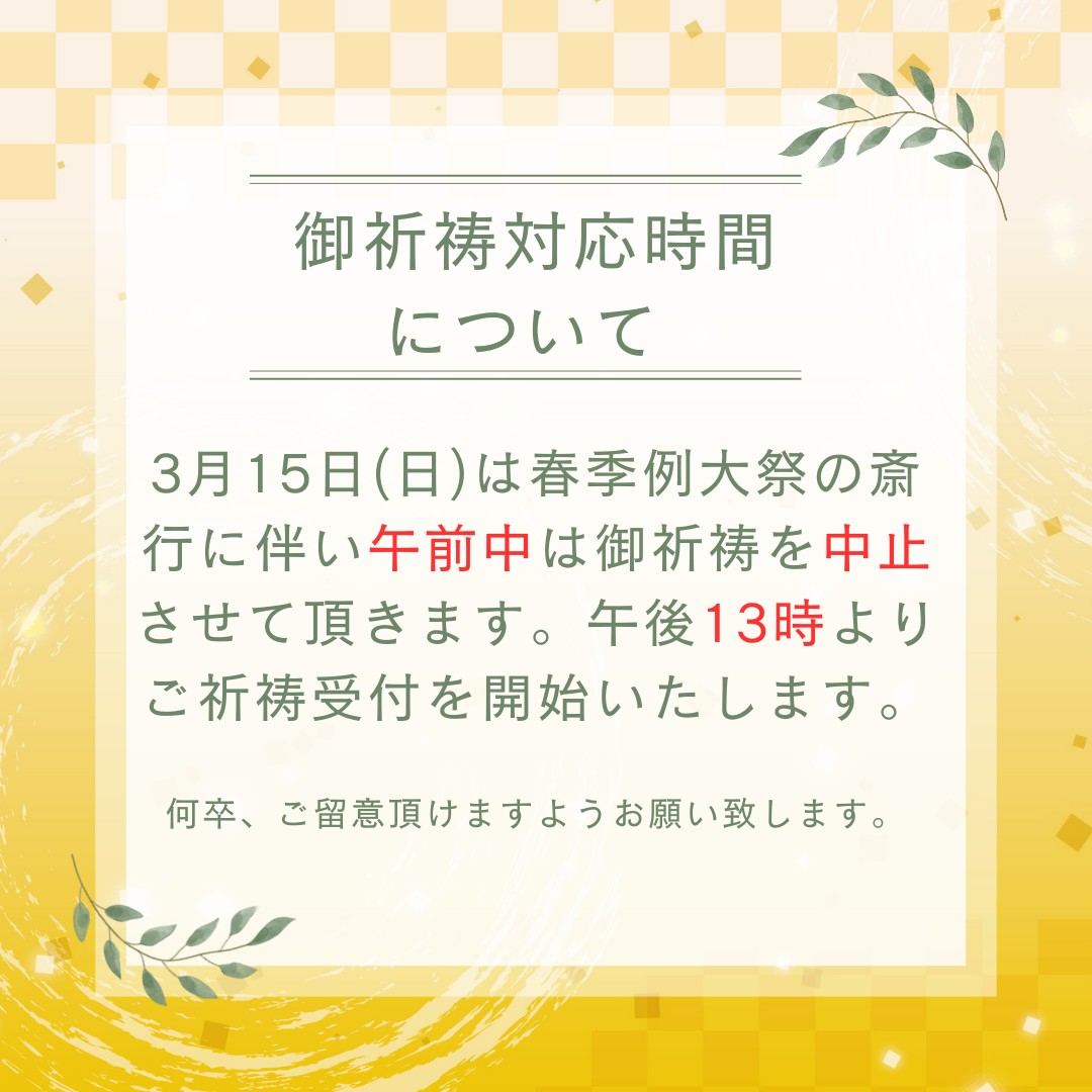 また当日の午前中は春季例大祭の為、ご祈祷を中止させて頂きます。